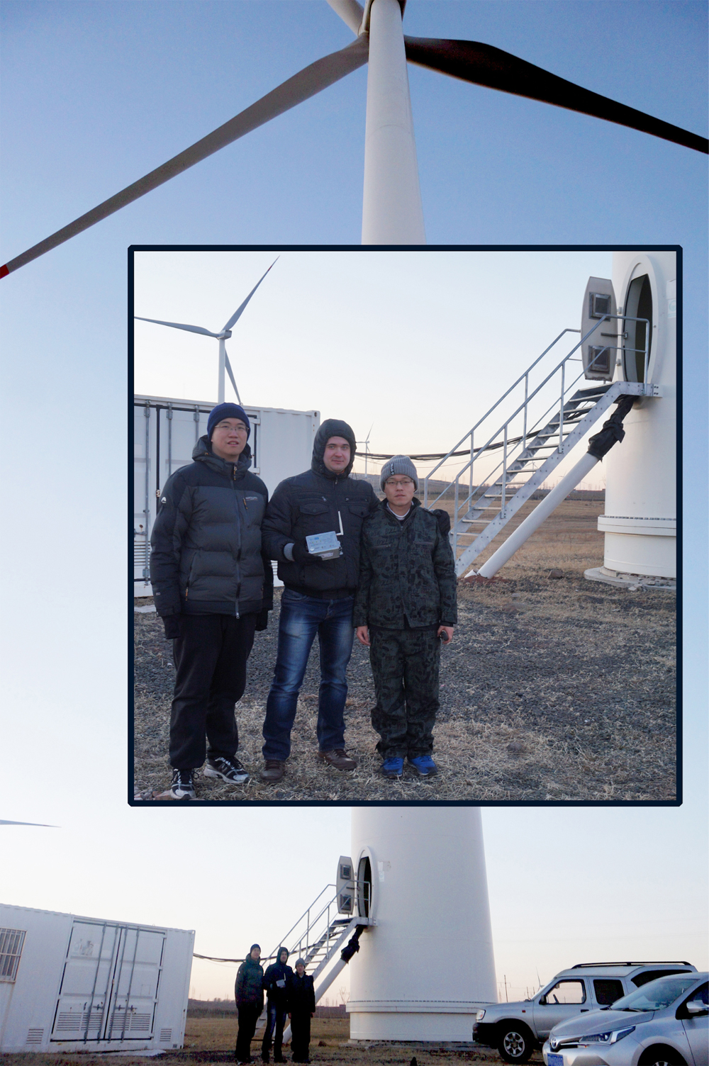 Сергей Васюкевич вместе с коллегами из компании Smartbow возле ветрогенератора, на котором проводились испытания системы VibroBox.